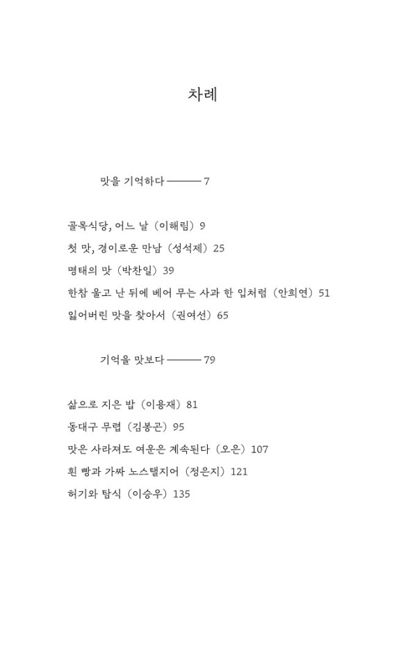 이 열 명의 작가들이 선사한 맛의 기억, 기억의 맛을 통해 달고, 쓰고, 시고, 맵고, 짜고, 싱겁고, 고소하고, 담백하고, 농후한 인생의 맛을 느껴보시겠습니까?