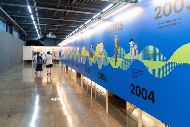 특별전시 〈파동〉은 원천 콘텐츠로서의 가치를 확장하면서 다른 미디어와 만나 확장되며 하나의 장르가 된 웹툰과 웹소설을 조망합니다. 다양하고 완성도 높은 작품들과 작가들의 있는 그대로의 이야기, 우리가 몰랐던 이야기, 20년의 역사를 만들어온 연대기, 그리고 우리가 작가들에게 건네는 이야기로 구성됩니다. 무엇보다 독창적 이야기로 세계적인 콘텐츠로 뻗어나가는 화려한 성장 뒤에는 쉴 틈 없이 엔진을 돌리는 작가들의 노고가 숨겨져 있습니다. 하루 평균 10시간의 시간을 몰입한 눈부신 창작물을 만들어내는 작가들에게 우리가 받은 행복을 감사로 돌려주는 메시지를 함께 만들어보는 섹션과 생활툰, 일상툰을 만드는 대표적인 인스타툰 작가들의 인터뷰, ‘오늘의 우리 만화상’과 같이 우수 작품으로 인정받은 작품들과 웹툰, 웹소설의 가치를 들여다보는 섹션 등 스토리 산업의 근간이 되기까지의 이 장르의 주역이 된 작가와 그 가치에 더 집중해봅니다.