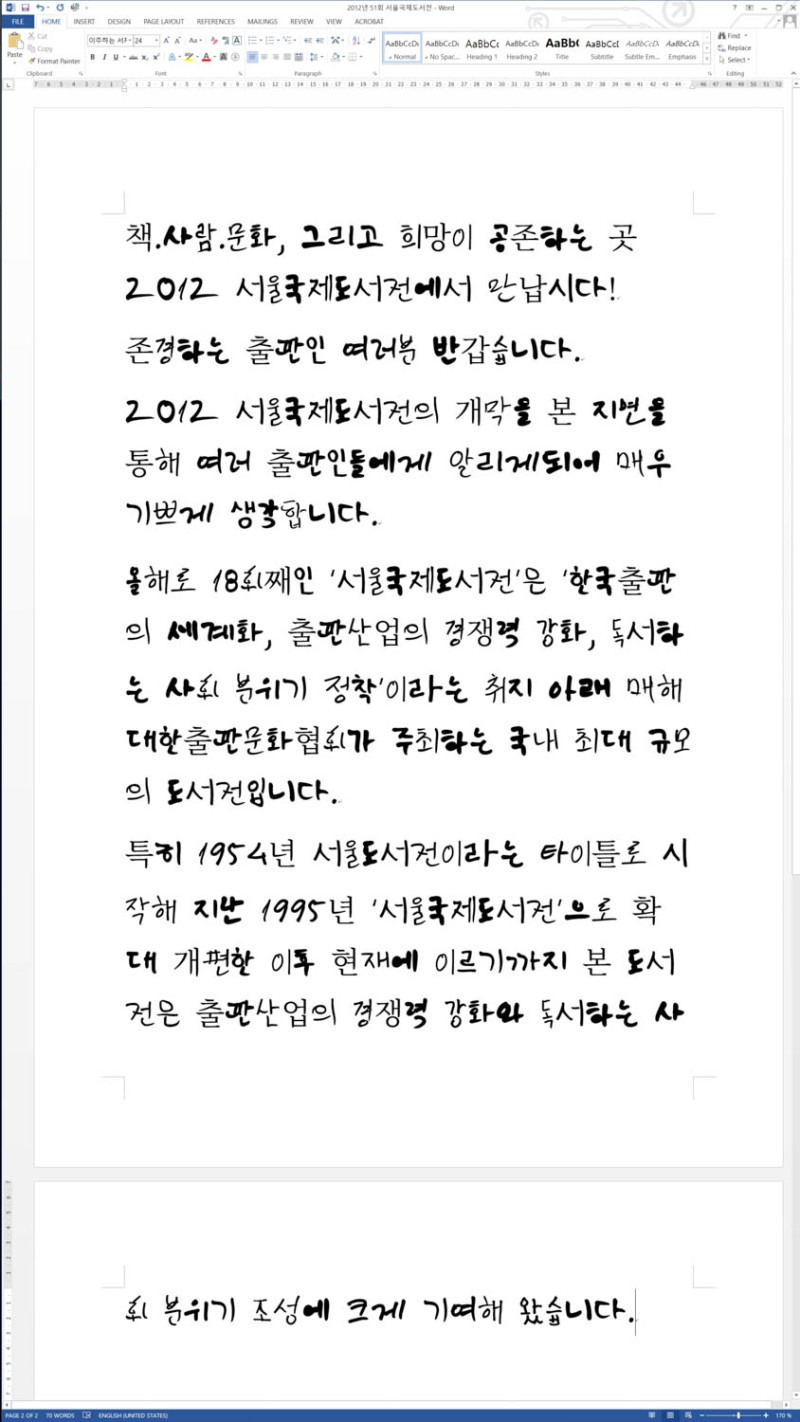 작가는 2018년, 2020년 두 차례에 걸쳐 한국에 거주하는 이주민 11개 국가 35명 참여자들의 손글씨를 모아 서체 〈이주하는 서체〉를 만들었습니다. 이번 전시에서 〈이주하는 서체〉는 서울국제도서전의 인사말을 낭독하기 위해 사용되었습니다. 해마다 작성되는 인사말은 도서전이 강조하는 내부의 관점을 압축적으로 드러내고, 국내 관객을 넘어 세계를 대상으로 한 환대의 메시지 속에서 우리가 바라는 세계화 혹은 국제적 행사의 면모를 확인할 수 있습니다.